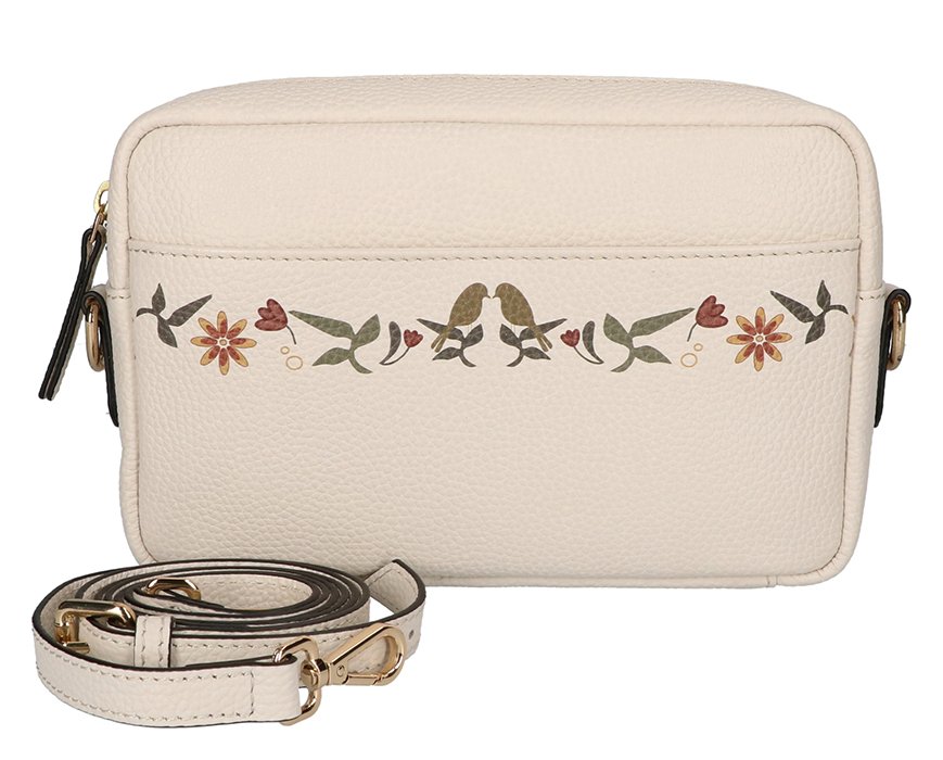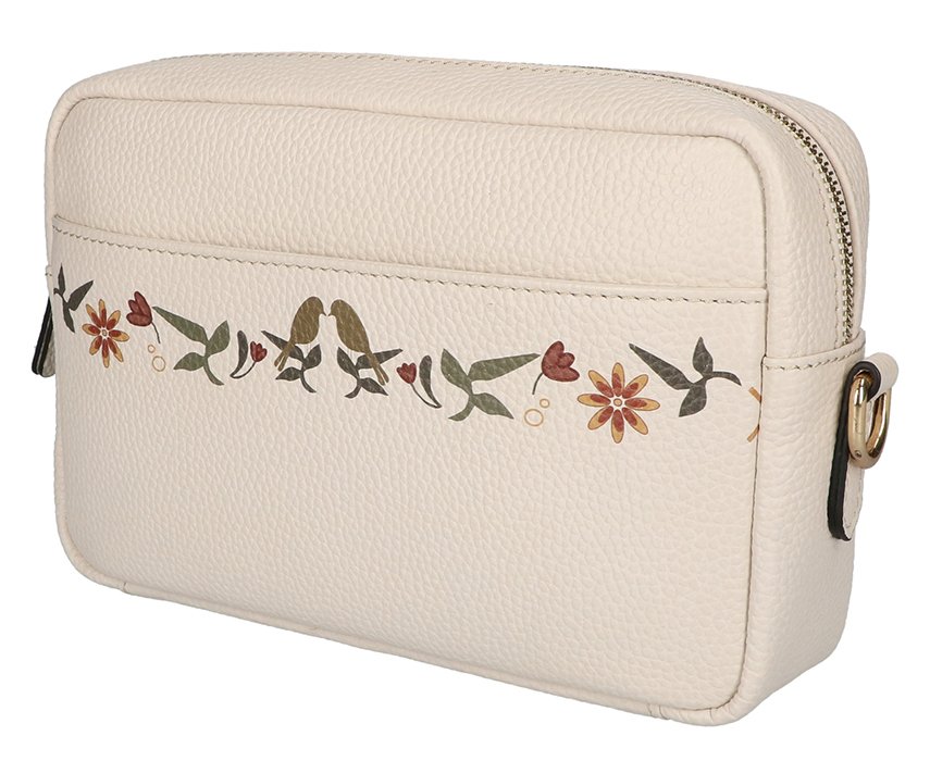 Mooie lederen handzame Crossbody in de kleur Off White met bloemen en vogels